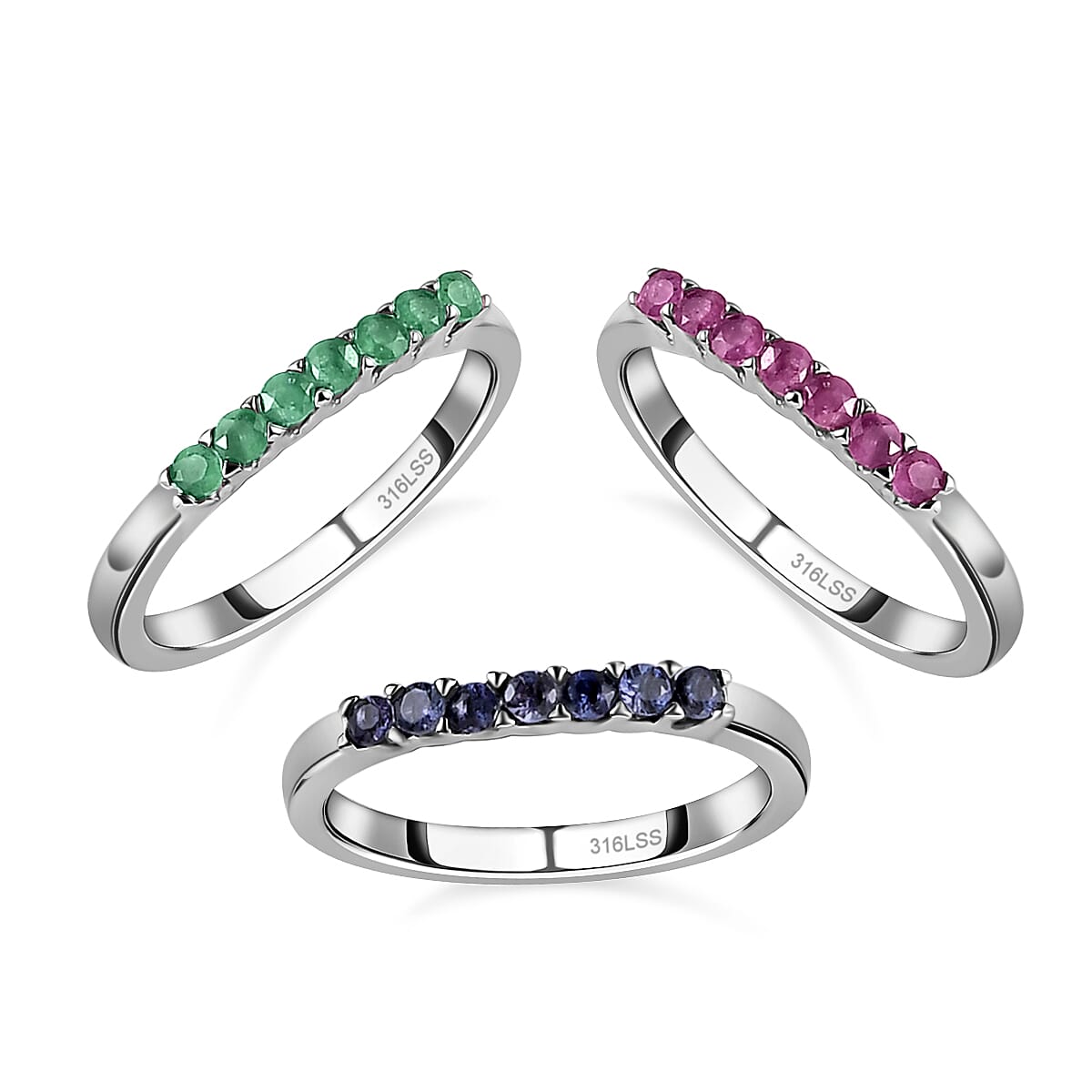Set of 3 Rings, Niassa Ruby Ring, Tanzanite Ring, Kagem Zambian Emerald Ring, Set of 3 Rings in Stainless Steel, 7 Stone Wedding Band Rings For Women, Gifts For Her 1.00 ctw