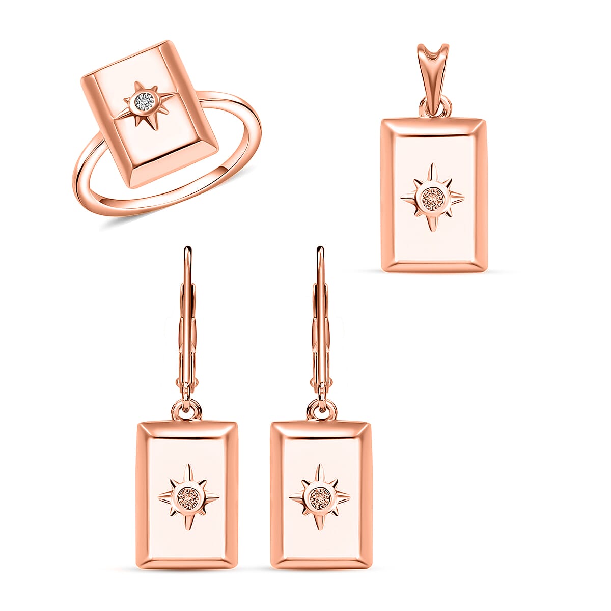 Set of 3, White Diamond Bar Ring (Size 11.0), Earrings and Pendant without Chain in 18K Vermeil RG Over Sterling Silver