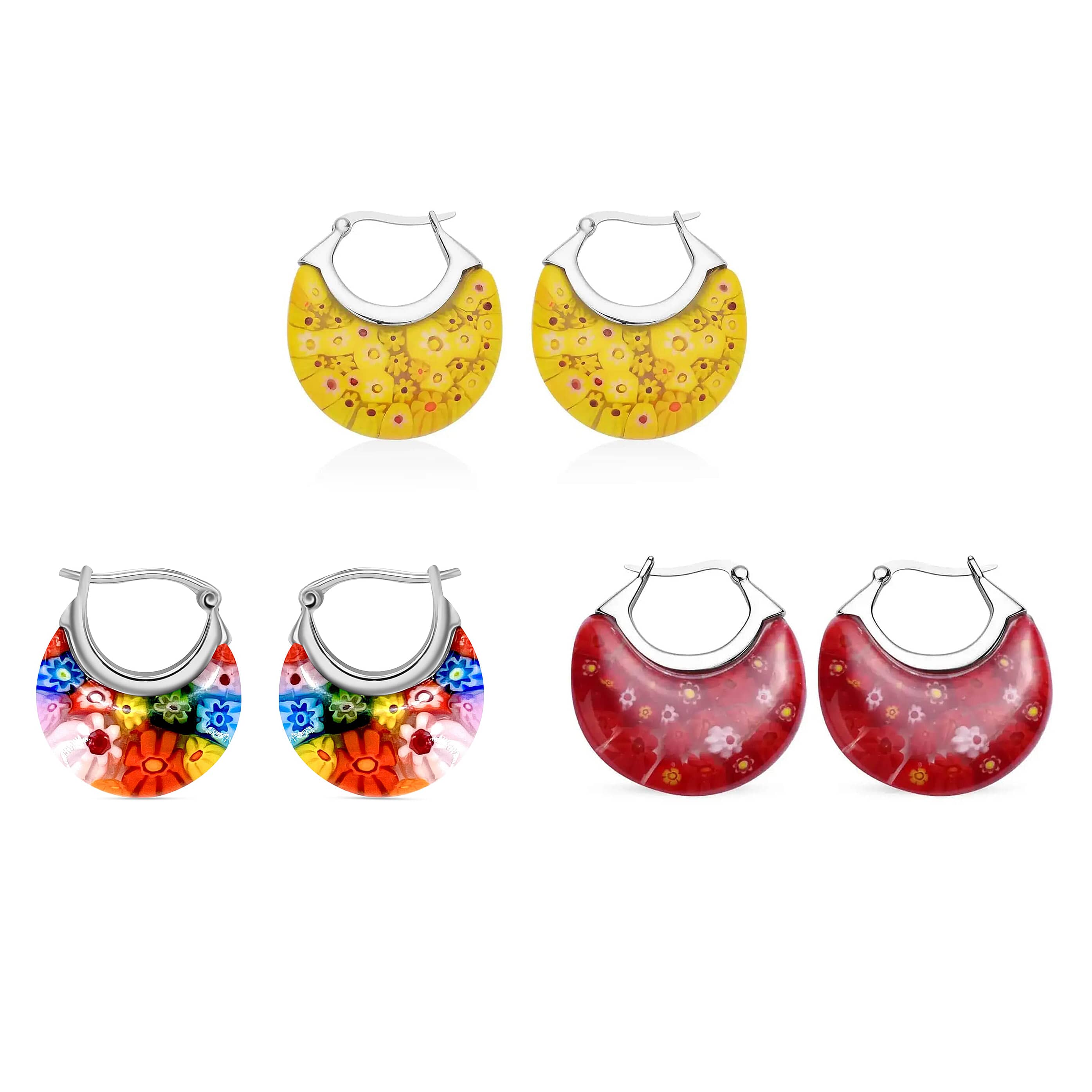 Set of 3 Yellow, Multi Color and Red Murano Style Basket Earrings in Stainless Steel (Del. In 10-12 Days)