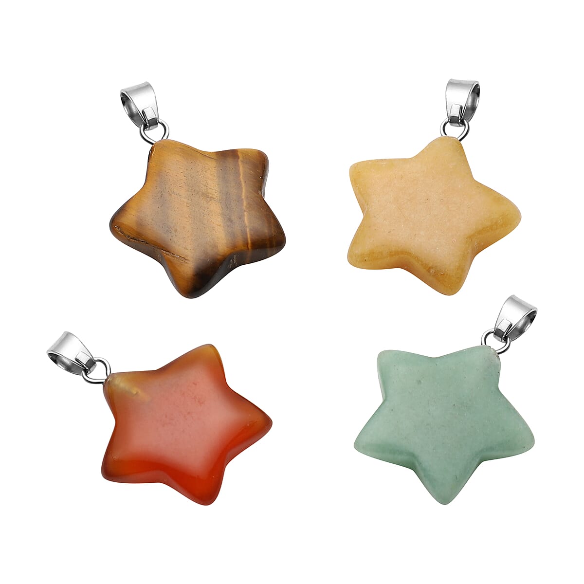 Set of 4 Green Aventurine, Red Agate, Yellow Quartzite and Yellow Tiger's Eye Star Pendants in Silvertone 48.00 ctw