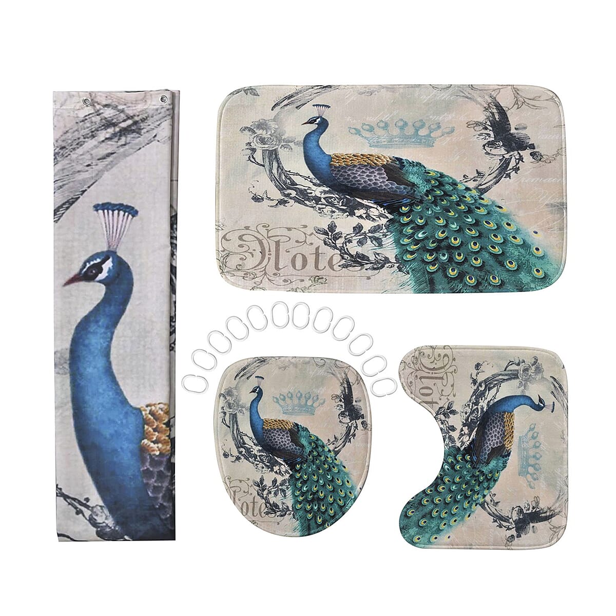 Set of 4 Green Peacock Pattern Bathroom 100% Polyester Shower Curtain, Floor Mat, Toilet Cover, Toilet Mat