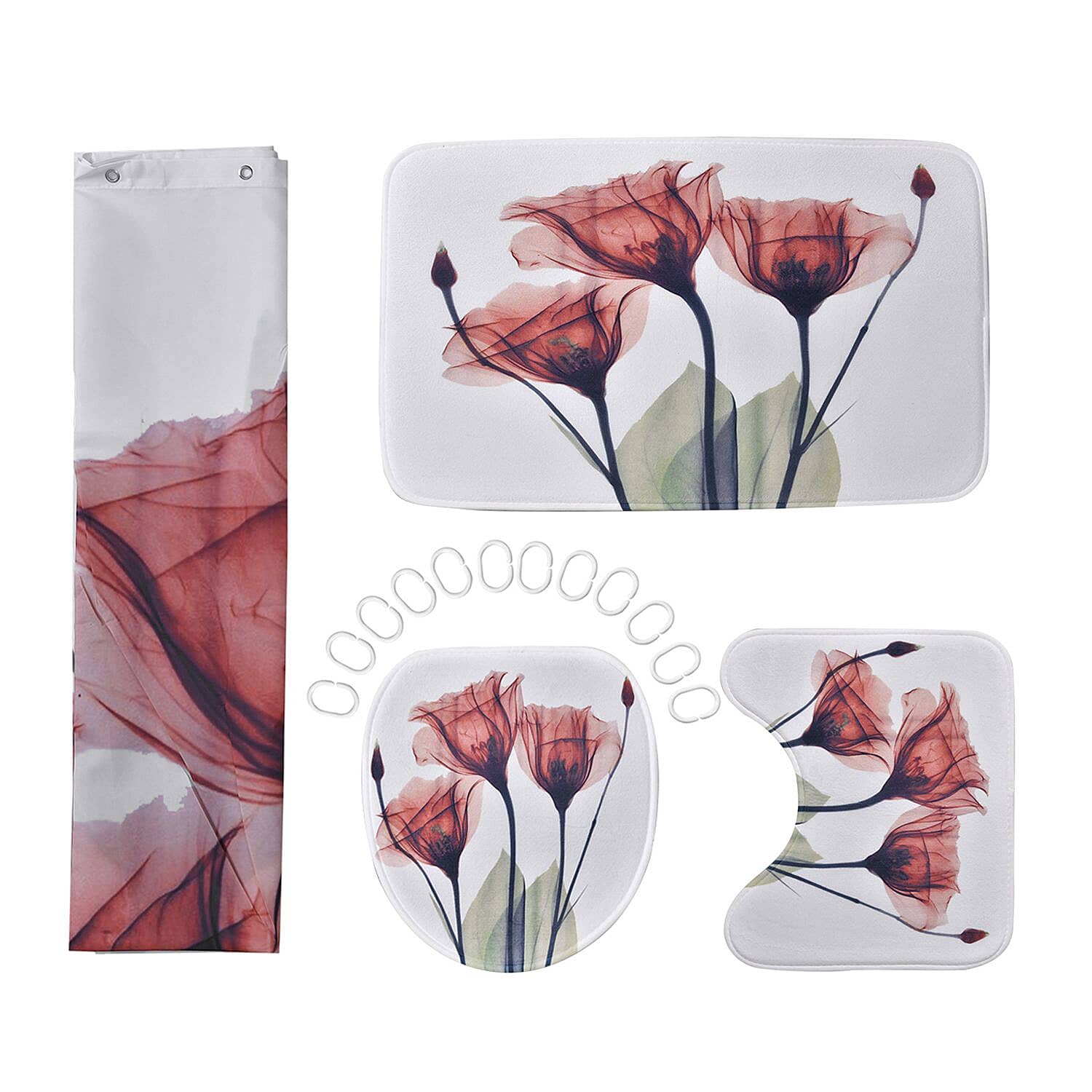 Set of 4 Green Red Flower Pattern Bathroom 100% Polyester Shower Curtain (70"x70''), Floor Mat (29"x17.5''), Toilet Cover (13.5"x14.5''), Toilet Mat (17.5"x14.5'')