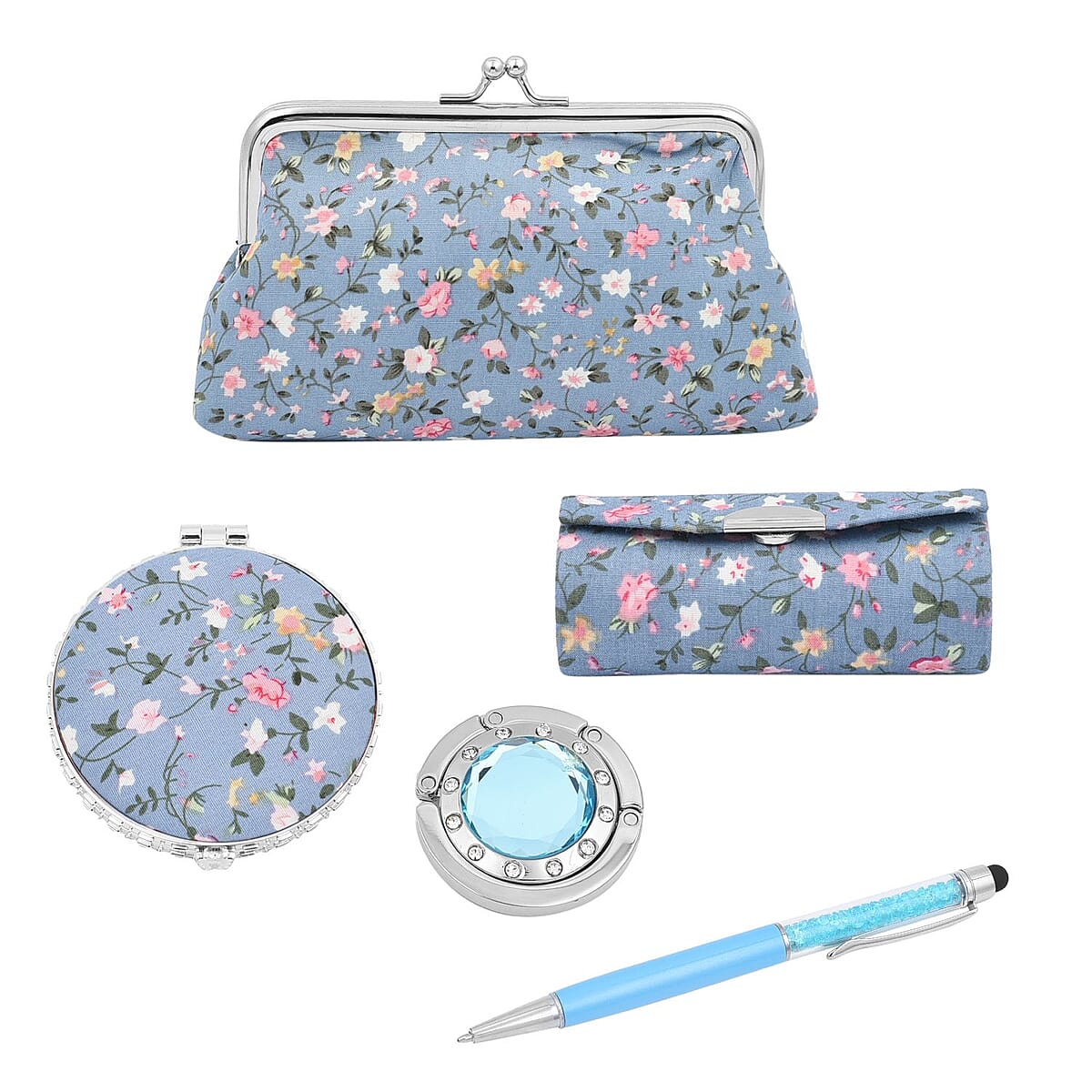 1 Compact Mirror, 1 Lipstick Case, 1 Coin Purse, 1 Bag Holder, 1 Ball Point Pen |