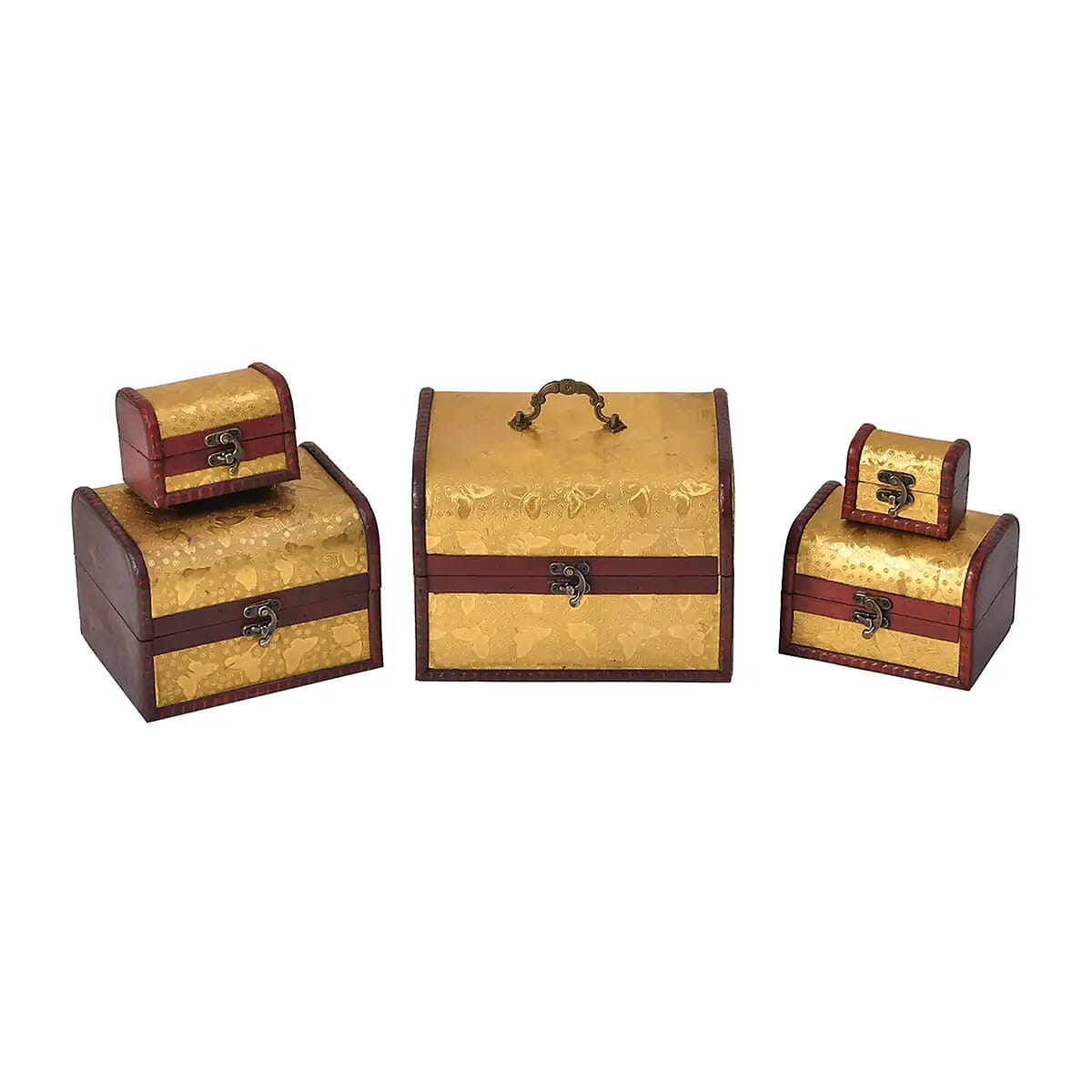 Indulge in a touch of opulence with our set of 5 exquisite jewelry chest boxes. Elegantly embossed and wrapped in sumptuous faux leather, these golden treasures offer an elegant haven for your cherished jewelry pieces. Store your jewelry in style and ensure it remains in impeccable condition with these masterfully crafted chest boxes.