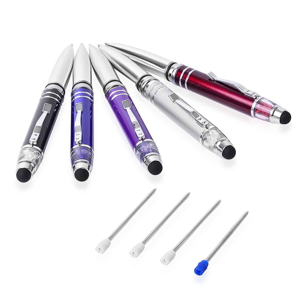 Get this five-piece set of multi-functional pens at an amazing deal. With three-in-one functions, including a ballpoint pen, stylus, and flashlight, the pen features sparkling multi-color acrylic crystals for an enhanced look. Use this elegant and chic pen set perfect for fun and learning with family.