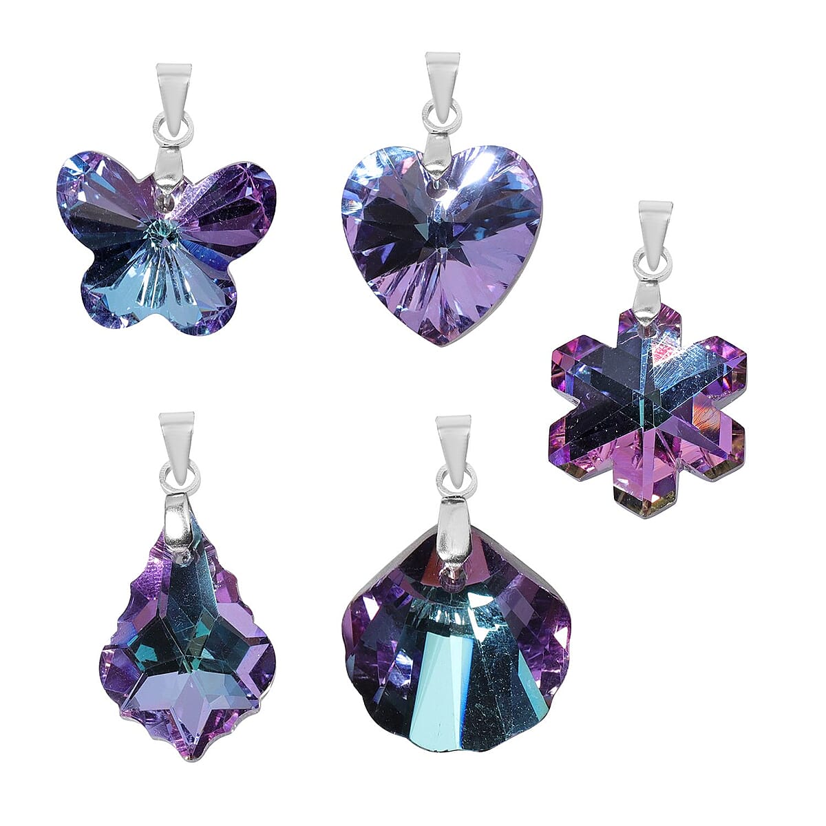 Set of 5 Purple Color Austrian Crystal Heart, Butterfly, Shell, Star, Heart and Fancy Shape Pendants Necklace 20-22 Inches in Silvertone