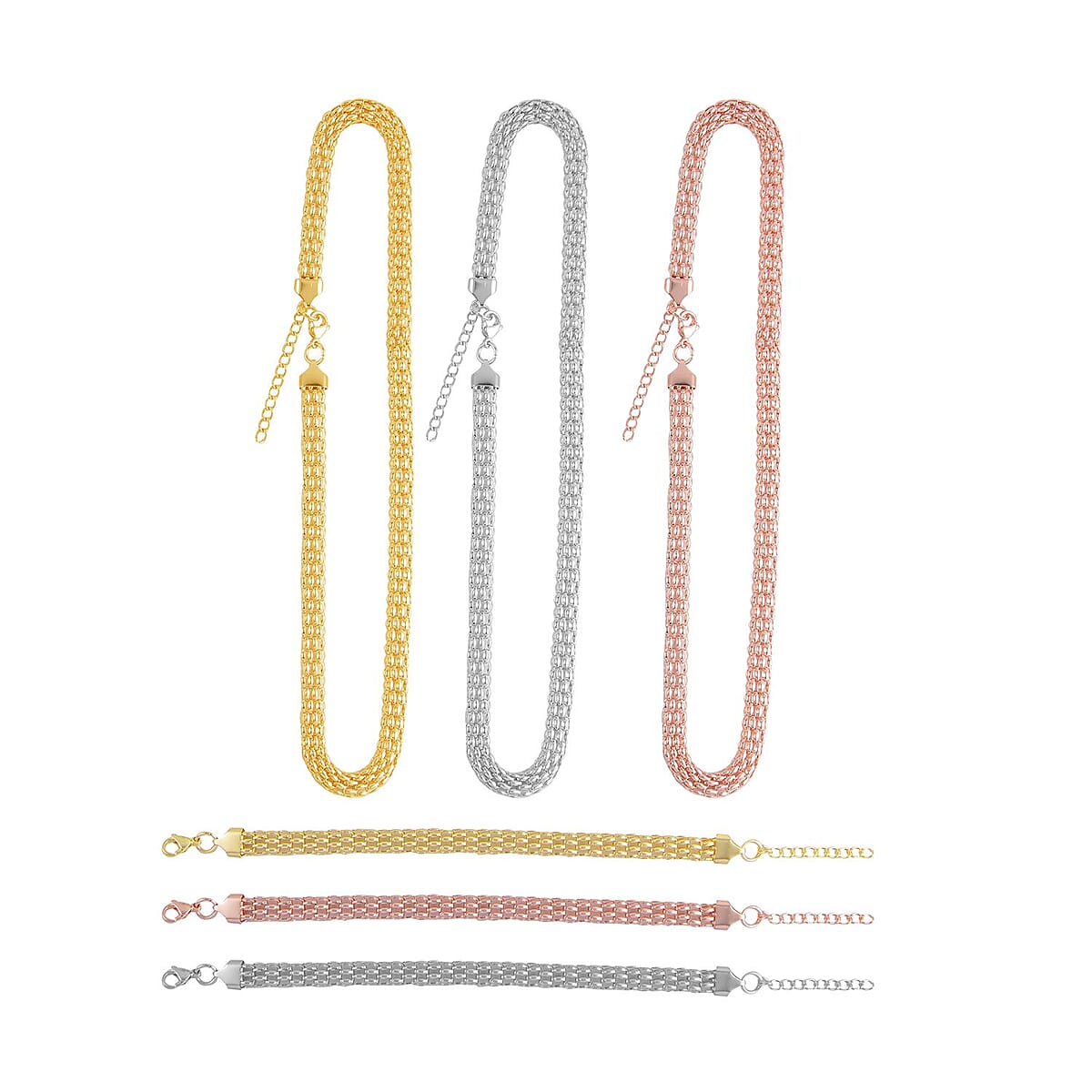 A. The set includes six pieces—three necklaces and three bracelets, all beautifully coordinated for versatile styling.