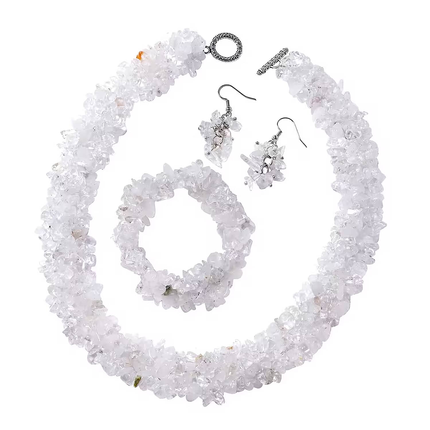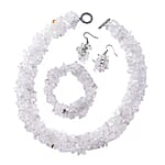 Set of Clear Quartz 920.00 ctw Chips Stretch Bracelet, Earrings and Necklace in Black Oxidized Stainless Steel 18.00 Inches
