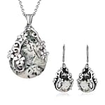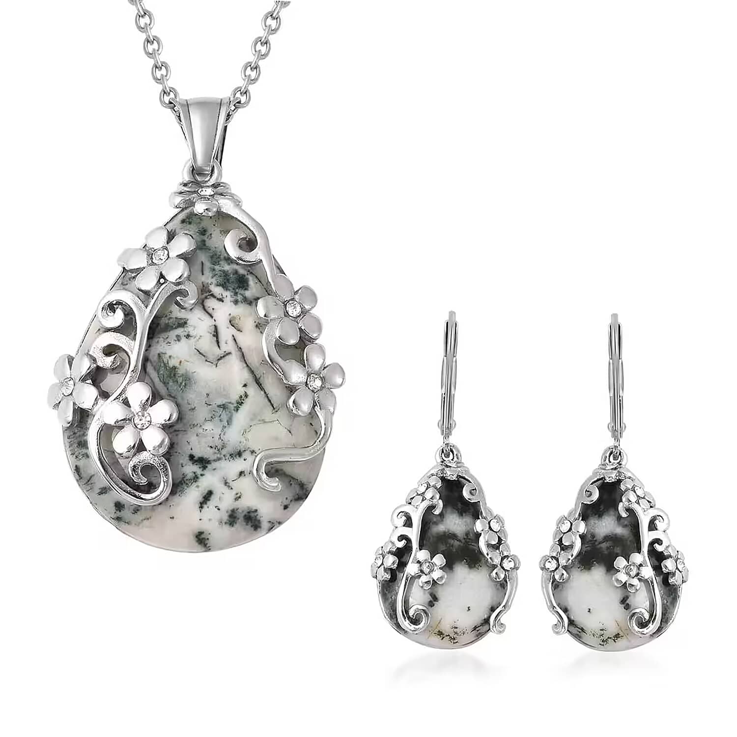 Set of Dendritic Agate 92.50 ctw Floral Earrings and Pendant Necklace, White Austrian Crystal Accent Jewelry Set in Stainless Steel, Birthday Gifts For Her
