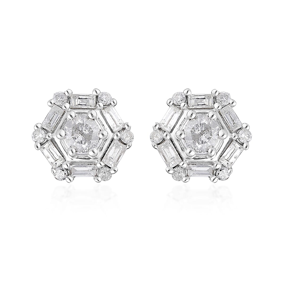 These diamond earrings are amazing and give your outfit a luxurious look. The stud earrings showcase a diamond in the center with the arrangement of round and baguette-shaped gemstones. Crafted in 10K white gold metal, these earrings give a fresh look to your adornment.