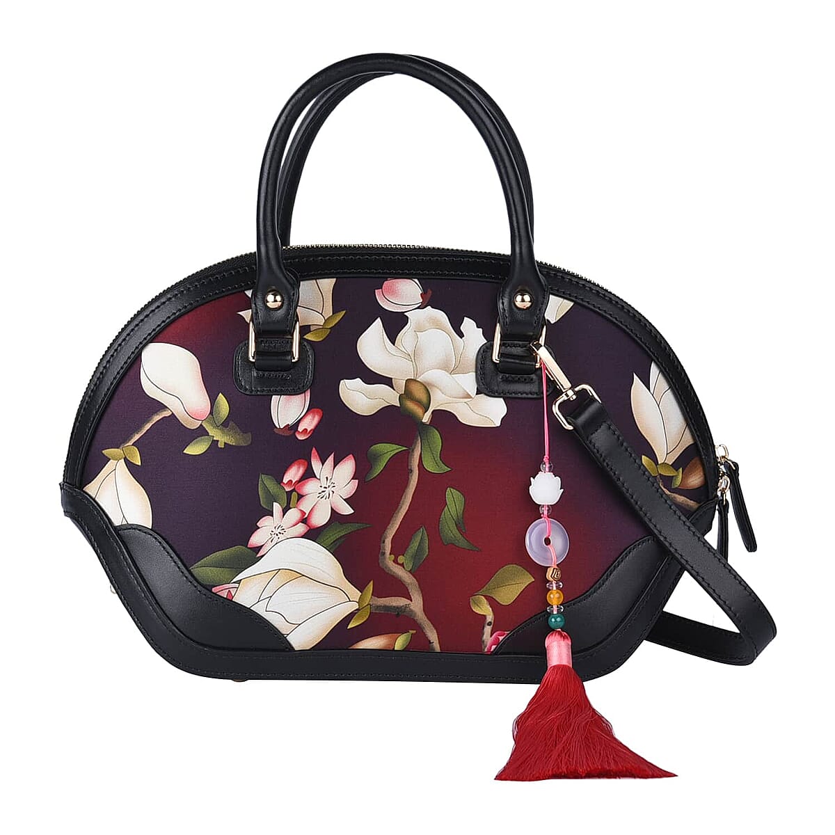 Shanghai Designer Inspired Closeout Dark Purple Flower Pattern Brocade Mulberry Silk Genuine Leather Tote Bag with Shoulder Strap