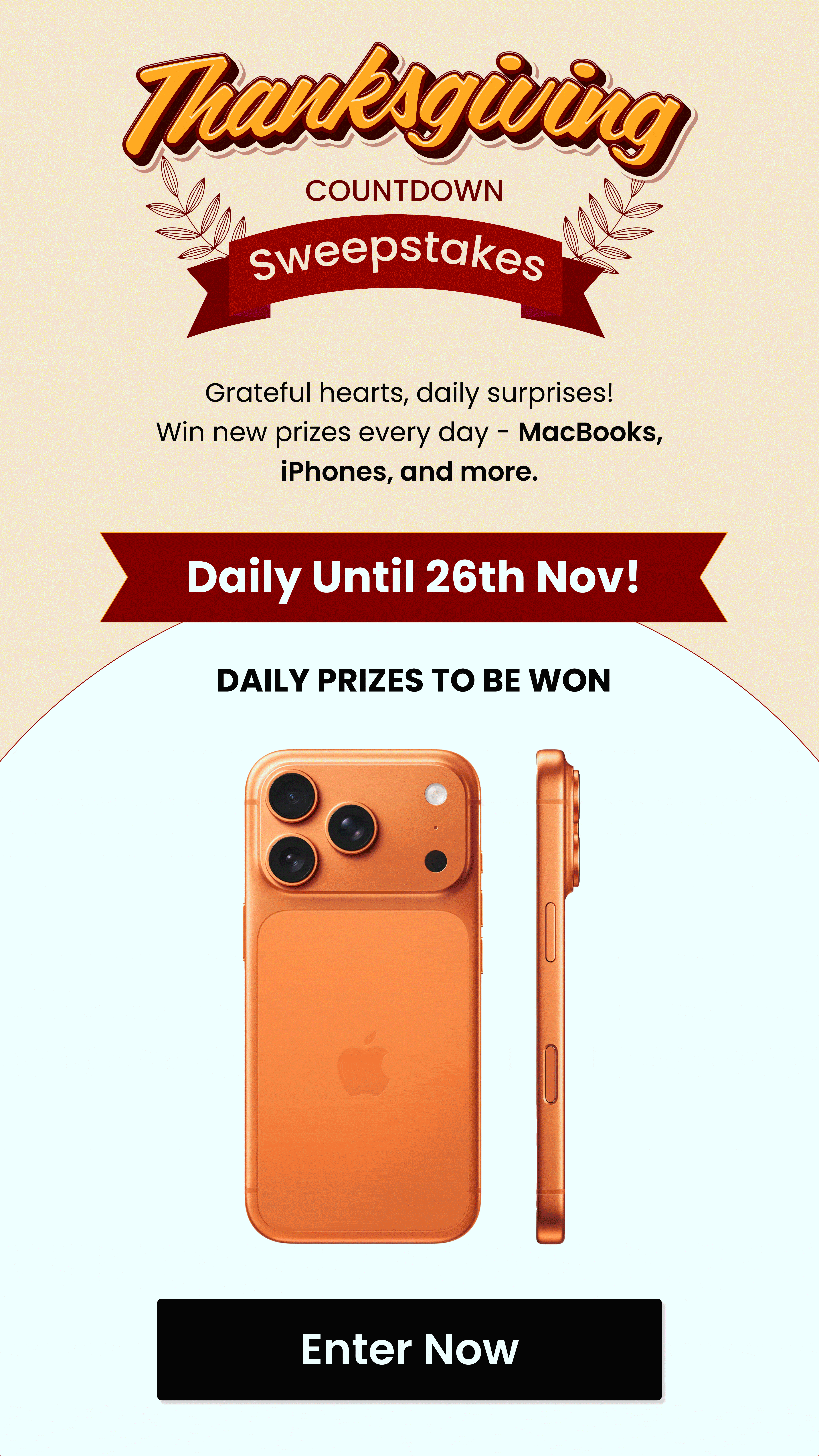 Between the turkey, the laughter, and the memories shared, this year’s Thanksgiving Countdown Sweepstakes 2025 promises to make your holiday even more joyful. Imagine sitting down for dinner knowing you’ve just won an iPhone or MacBook — that’s a Thanksgiving memory to cherish!