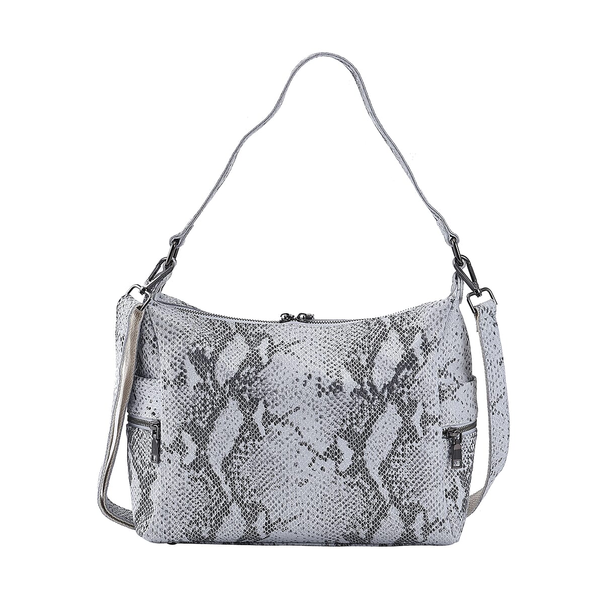 Silver and Black Python Embossed Print Genuine Leather Hobo Bag with Shoulder Straps