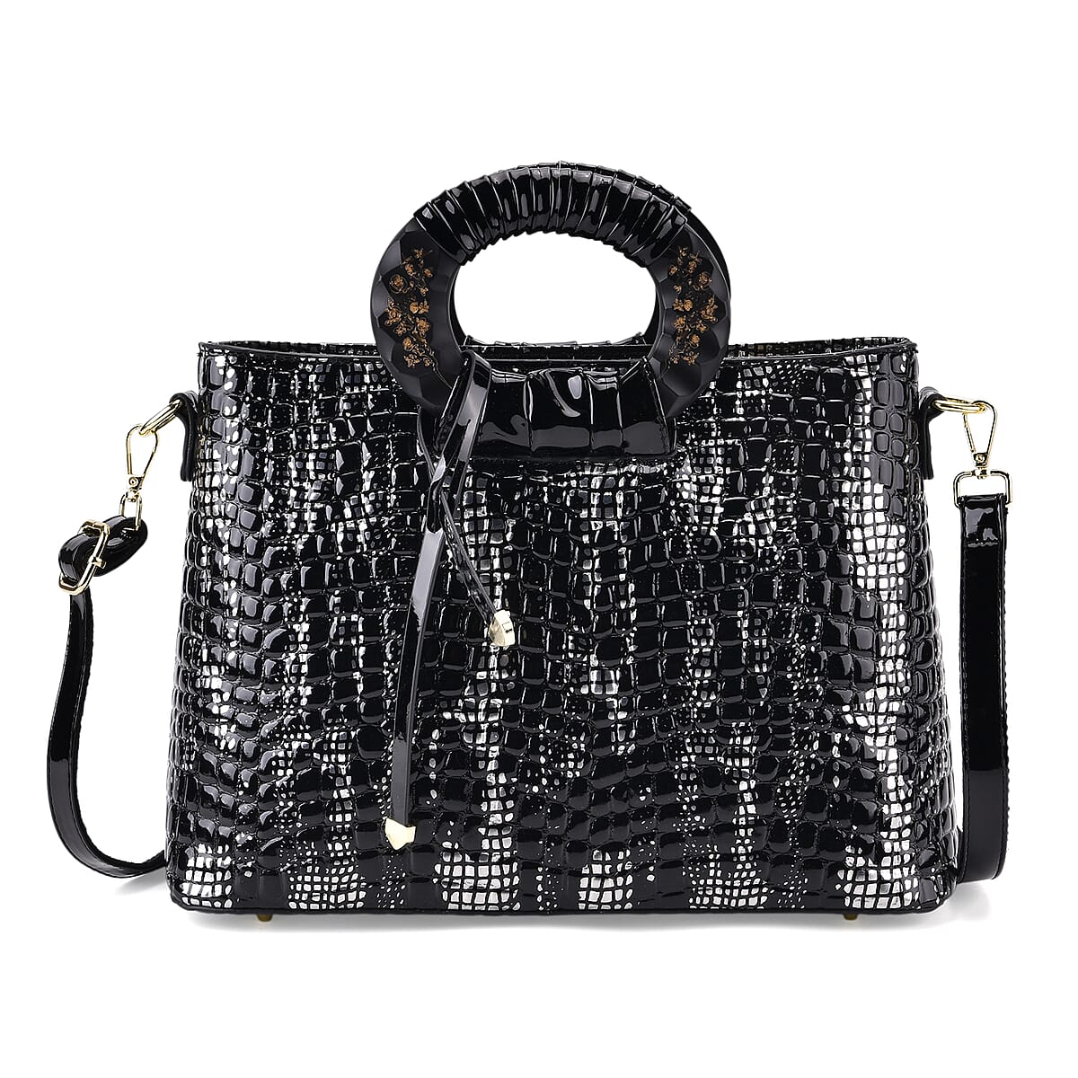 Silver Black Croco Embossed Faux Leather Crossbody Bag with Round Double Handle