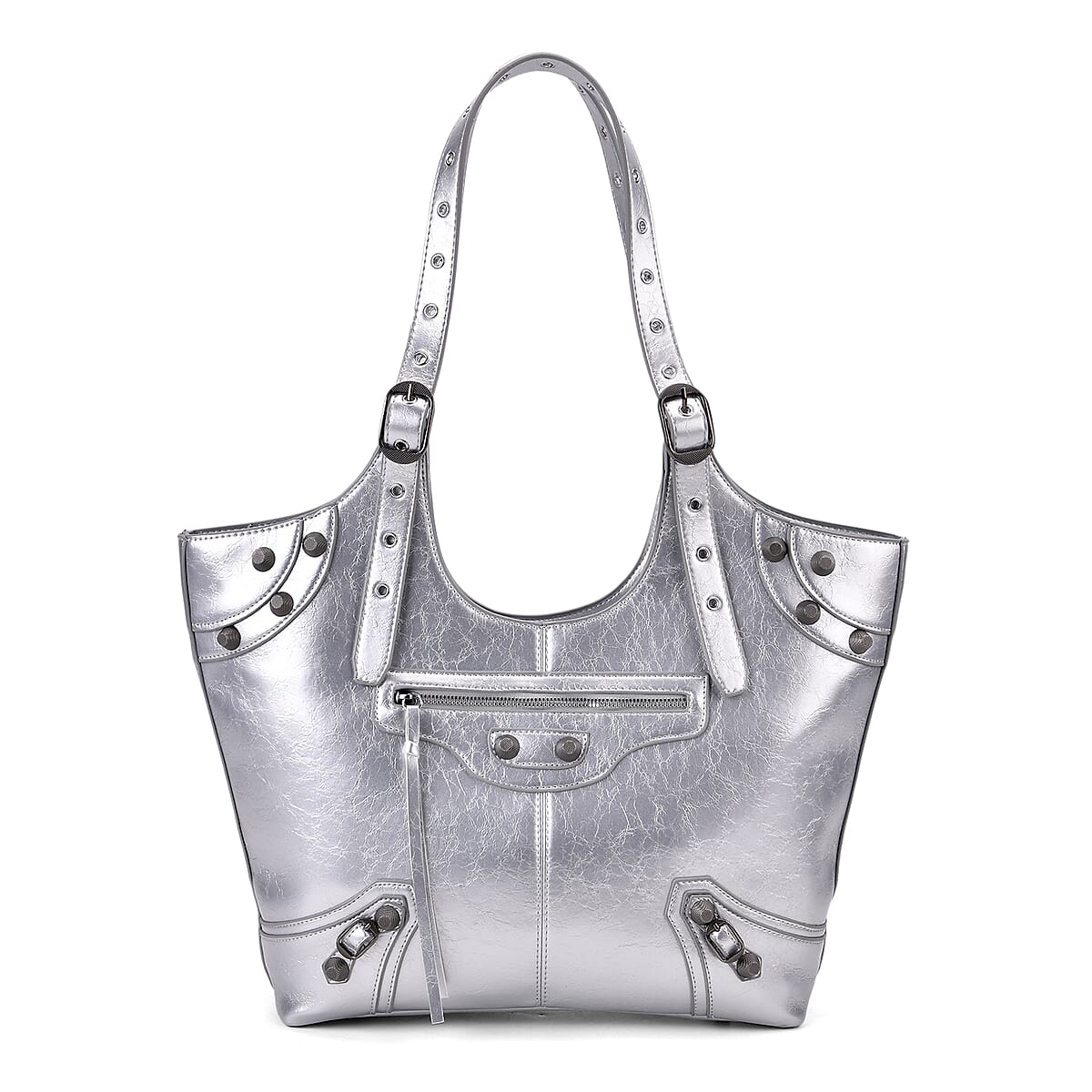 Silver Fashion Forward Faux Leather Rivet Tote Bag with Top Double Handle