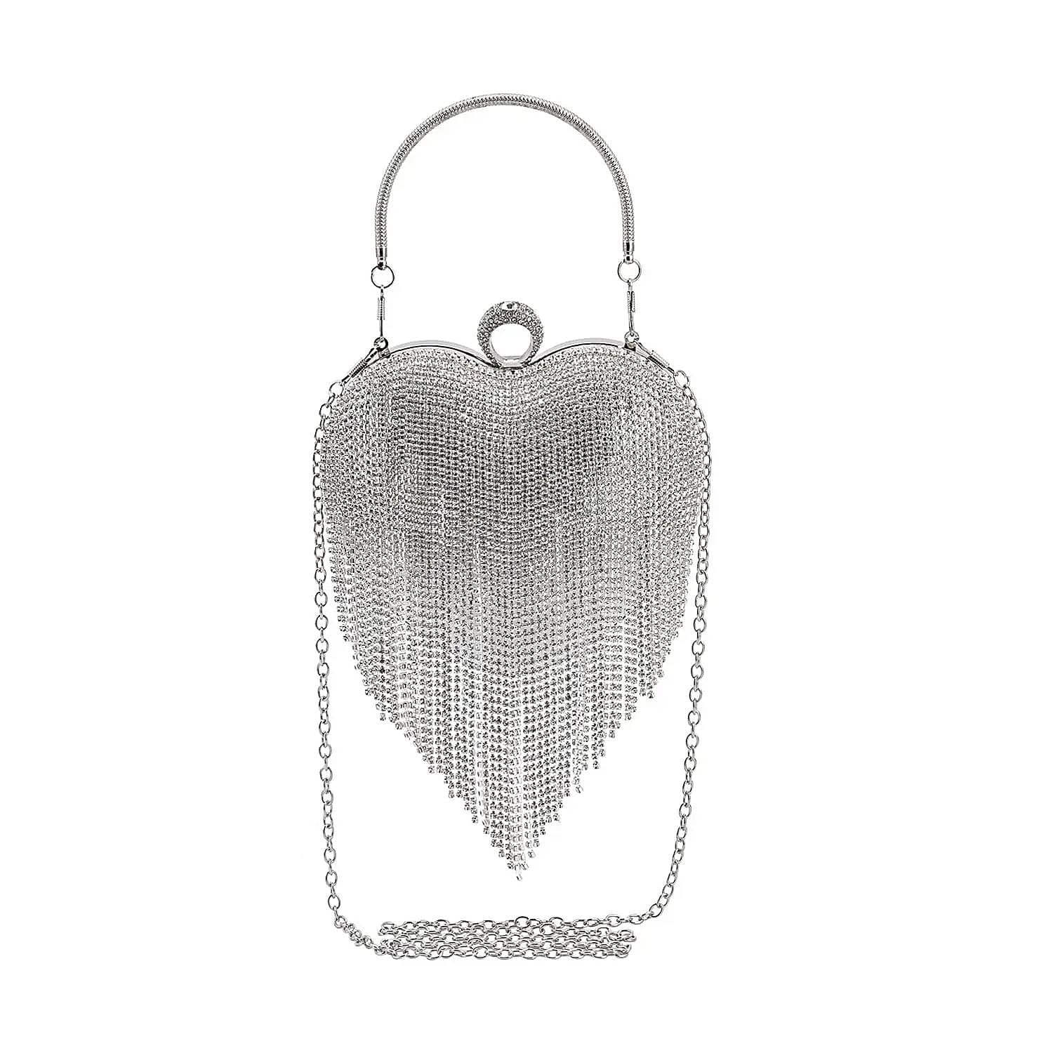 Silver Heart Shape Tassel Clutch Bag for Women with Handle and Removable Chain Strap , Women Purse , Designer Bags , Ladies Purse , Handbags for Women
