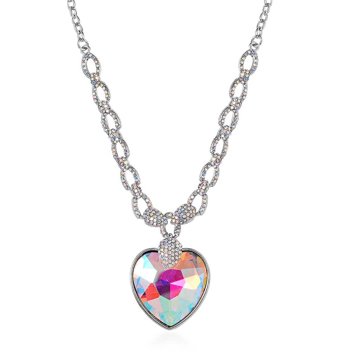 Simulated Aurora Borealis, Mystic White Austrian Crystal Heart Necklace in Silvertone 20-22 Inches