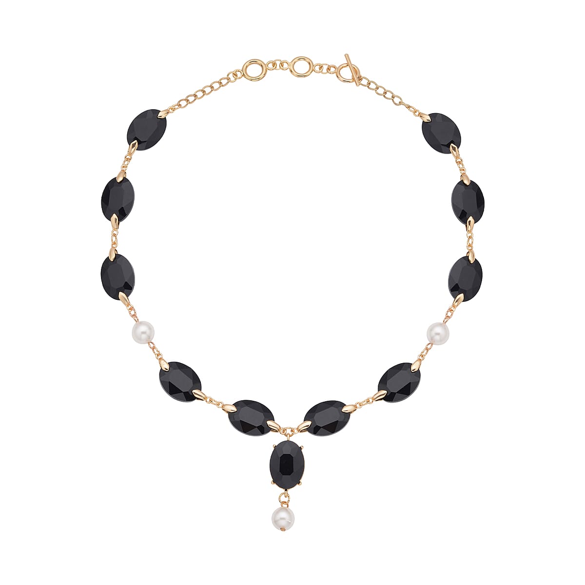 Simulated Black Spinel and White Pearl Necklace 22-23 Inches in Goldtone