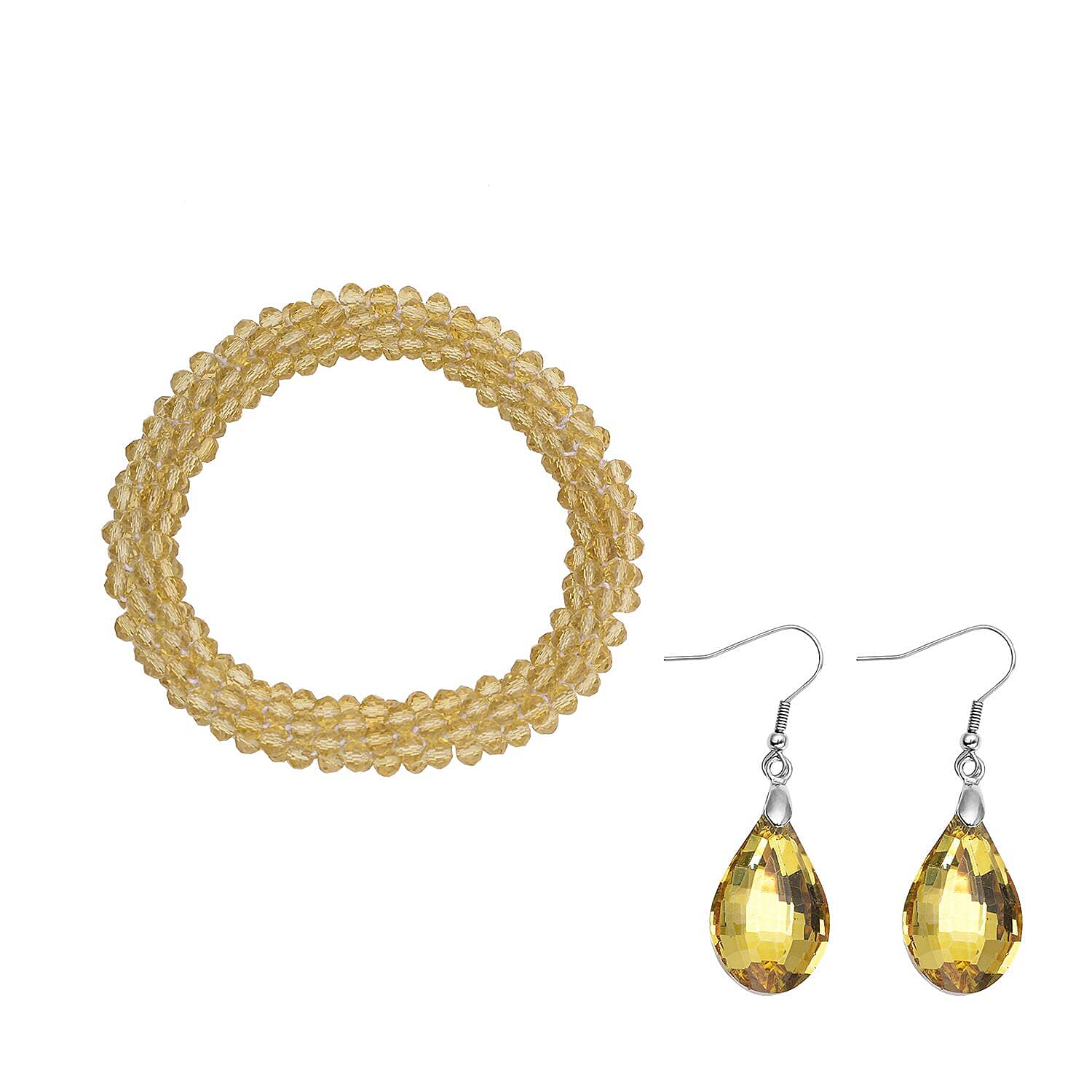 Simulated Citrine Beaded Stretch Bracelet and Drop Earrings in Silvertone
