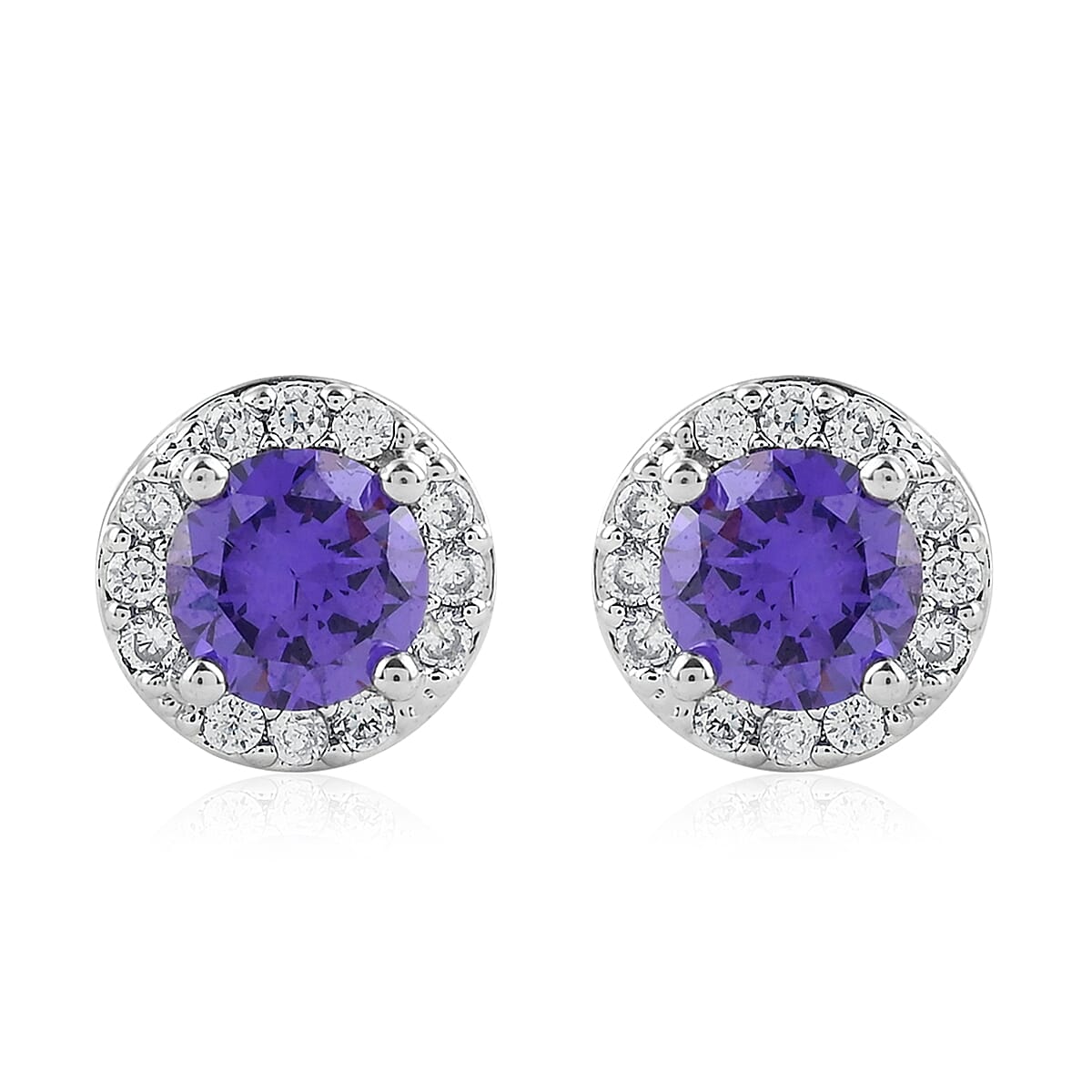 Simulated Dark Purple Sapphire and Simulated Diamond Halo Stud Earrings in Silvertone