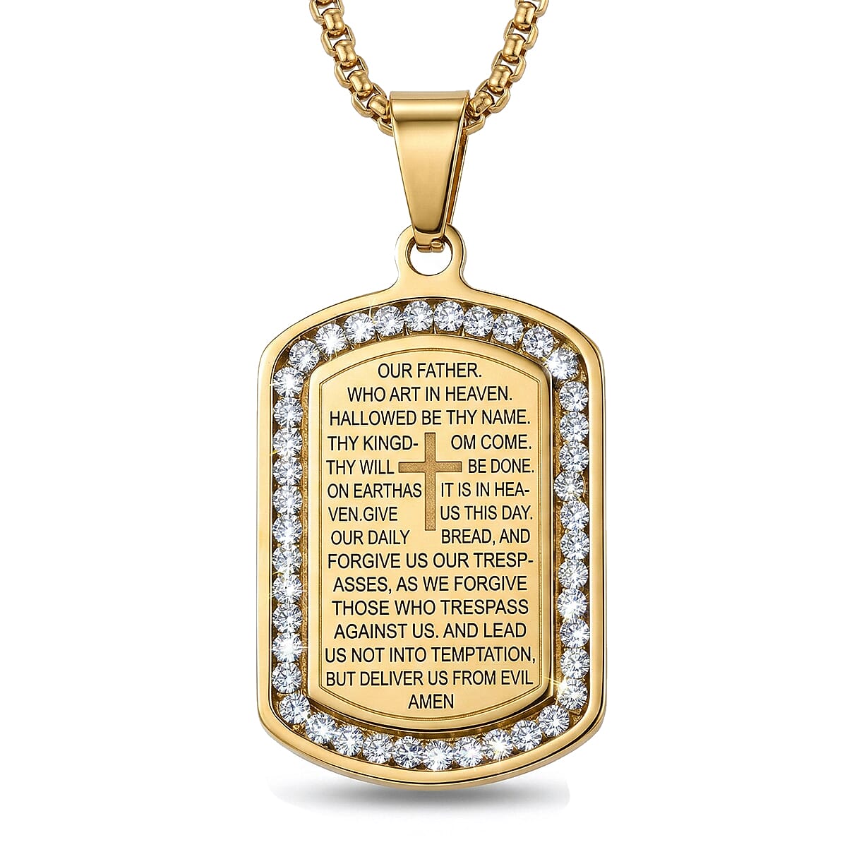 Elevate your style with this simulated diamond Lord’s prayer pendant necklace in 316L stainless steel. This elegant spiritual pendant necklace showcases sparkling simulated diamonds highlighting the engraved prayer. Durable stainless steel ensures lasting shine and meaningful everyday.