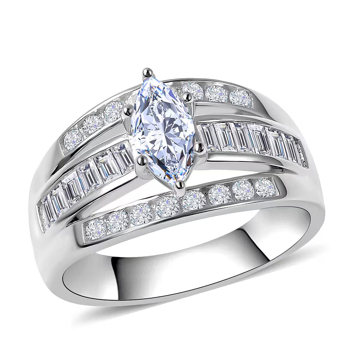 Evolving a timeless classic, this simulated diamond ring in sterling silver is a contemporary vision of band style. Featuring three rows of simulated diamond rounds and baguettes set in channels, this stylish women’s ring promises to take your style game a notch higher with its slightly elevated prong-set marquise simulated diamond in the center.
