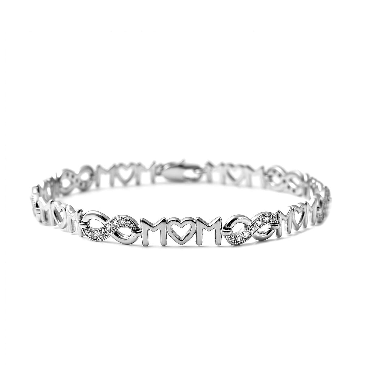 The simulated diamond MOM and infinity link bracelet draw inspiration from the infinity design. This simulated diamond bracelet symbolizes an infinite bond of love with your mom. The simulated diamonds are encrusted on the twisted strand of the bracelet connected with the MOM. This infinity link bracelet is framed in sturdy metal. The lobster claw clasp ensures a comfortable fit.