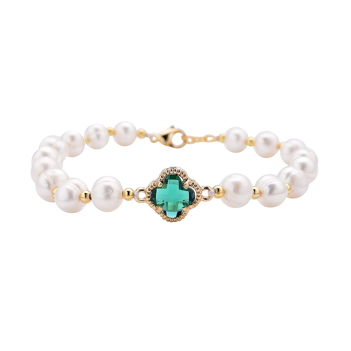 Simulated Emerald and White Freshwater Pearl Bracelet With Four Clover Leaf Charm in Goldtone Lobster Clasp (7.5-9.5-In)