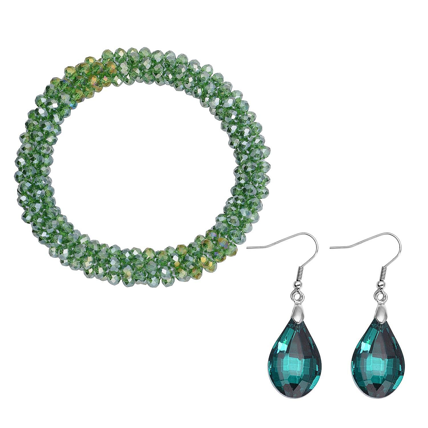 Simulated Emerald Beaded Stretch Bracelet and Drop Earrings in Silvertone