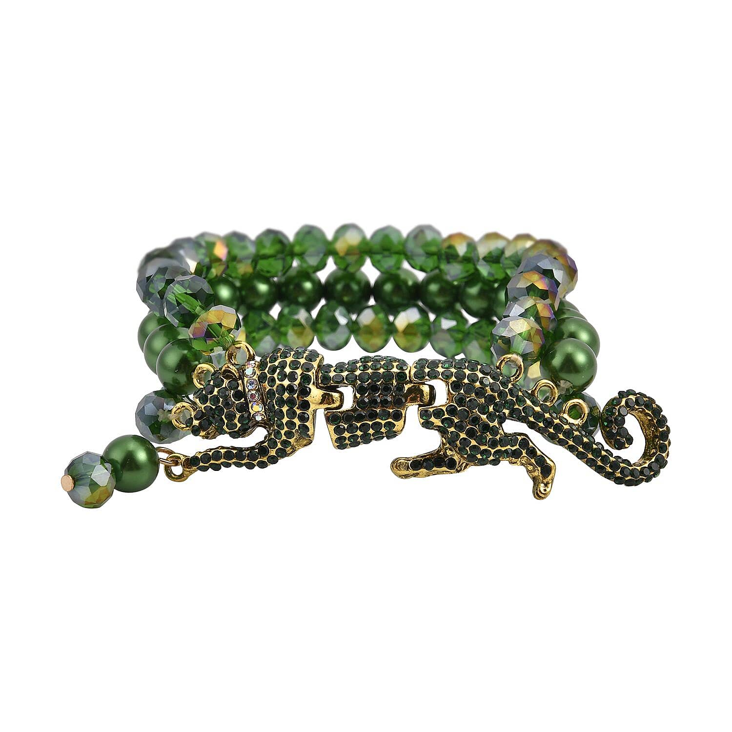 Simulated Green Pearl and Multi Gemstone Multi Row Bracelet with Leopard Charm in Goldtone (7.5-9.5In)