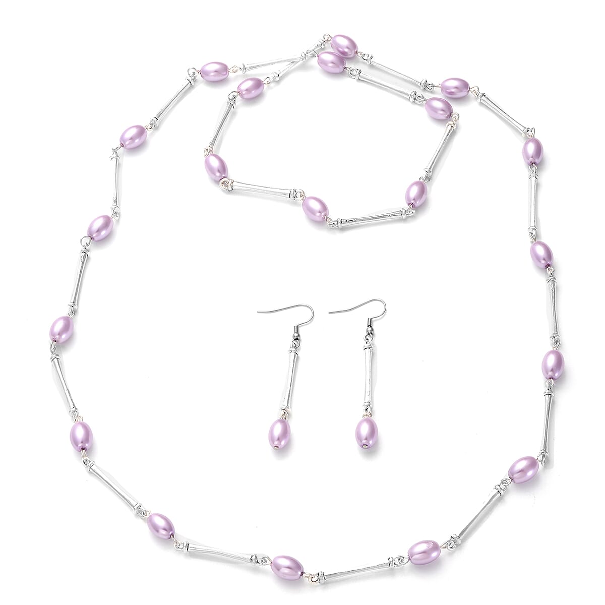 Simulated Lavender Color Pearl 7-9mm Necklace 38 Inches and Earrings in Stainless Steel
