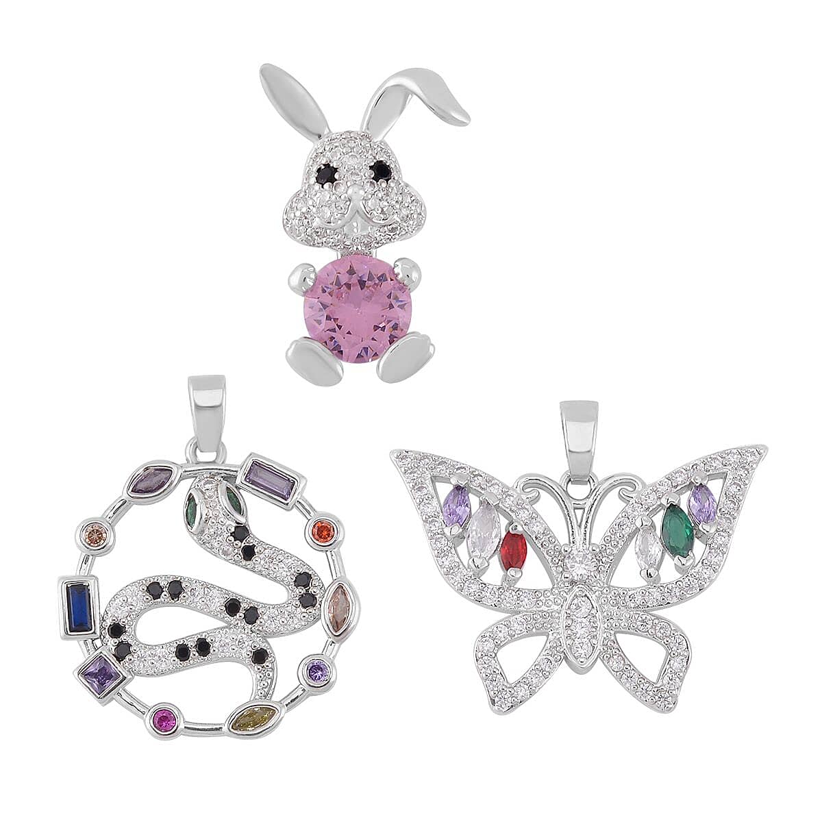 Simulated Multi Color Diamond 7.30 ctw Set of 3 Butterfly, Snake and Rabbit Pendant without Chain in Silvertone