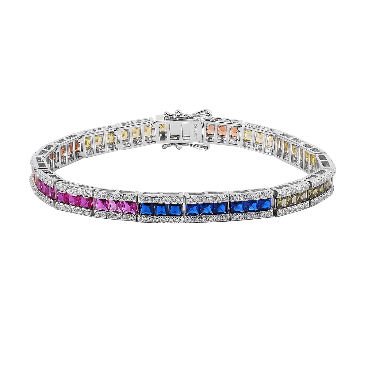 Indulge in the enchanting allure of our simulated multi-color diamond tennis rainbow bracelet in rhodium over sterling silver – a radiant masterpiece that seamlessly blends sophistication with a burst of vibrant hues. Elevate your style with this dazzling bracelet that effortlessly captivates attention and adds a touch of glamour to every ensemble. Crafted with precision and passion, this bracelet is not just an accessory; it's an expression of your vibrant personality and unique sense of fashion.
