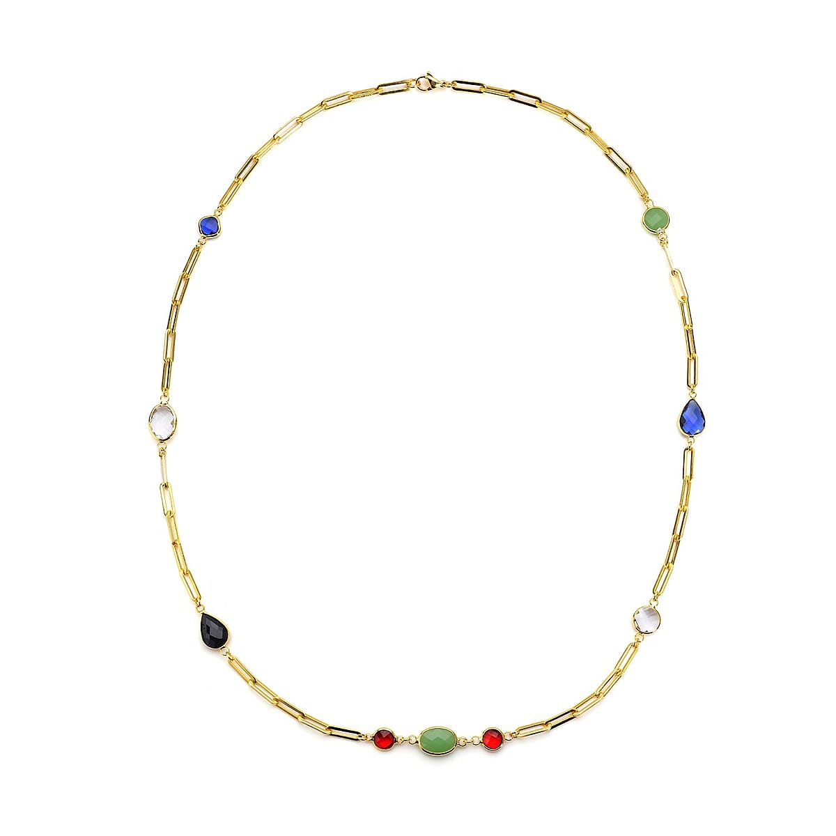 Simulated Multi Gemstone Paper Clip Chain Station Necklace (28 Inches) in ION Plated YG Stainless Steel , Tarnish-Free, Waterproof, Sweat Proof Jewelry