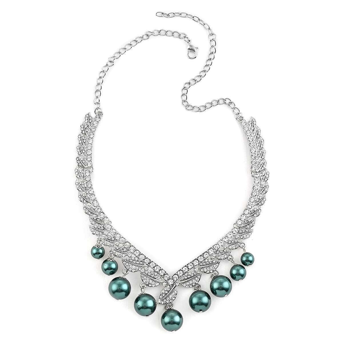 A fine fusion of timeless elegance with a modern appeal, this necklace is featured here that is best suited for you to don on celebratory occasions. Studded with Simulated peacock pearls and White Austrian crystals, this bib necklace wins you tons of compliments as you pair it with your favorite apparel.