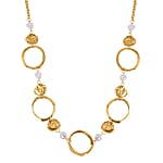 A. It is an opera-length fashion necklace featuring simulated pearls and textured goldtone accents.