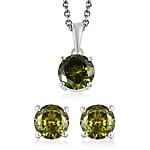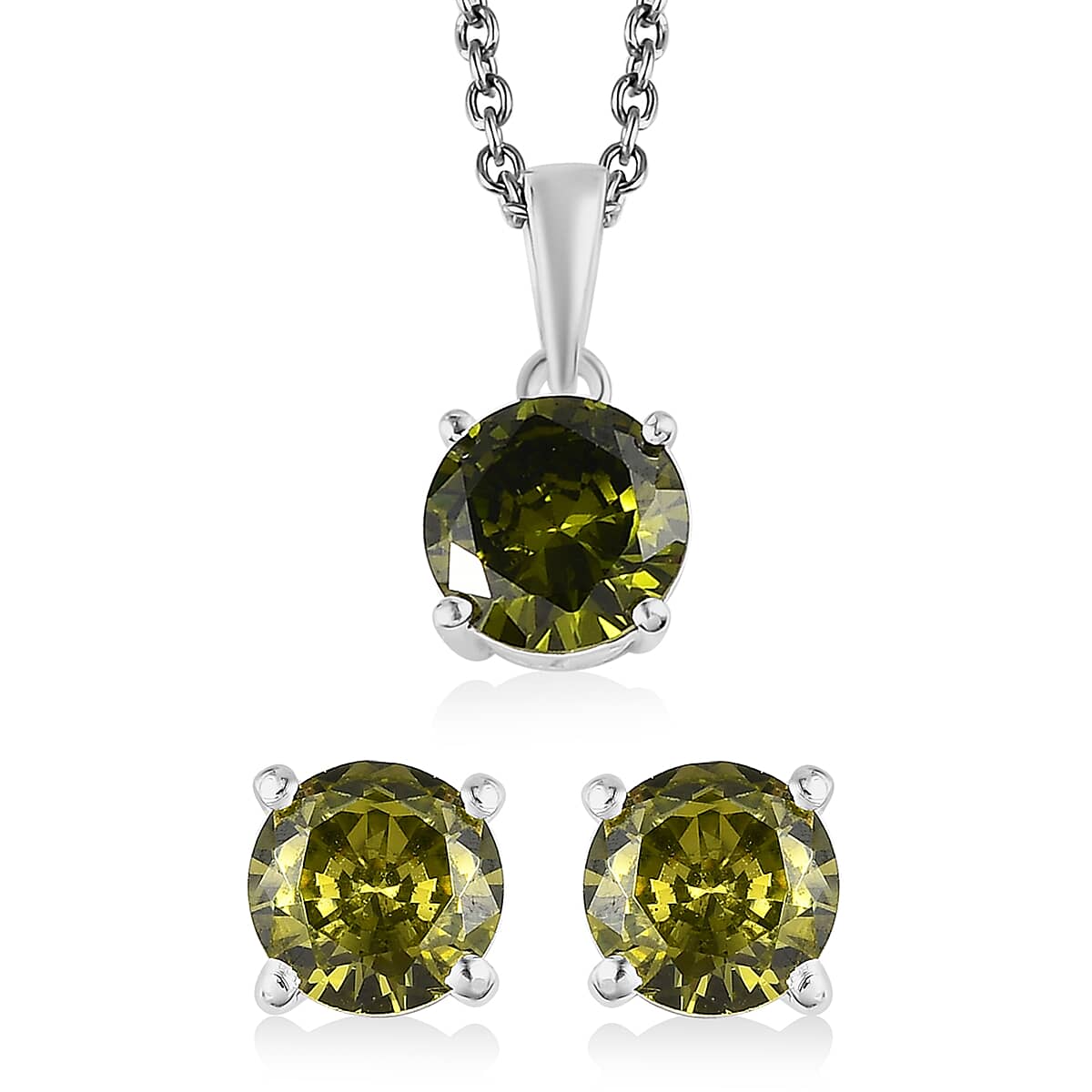 Simulated Peridot Diamond Solitaire Stud Earrings and Pendant in Sterling Silver with Stainless Steel Necklace 20 Inches