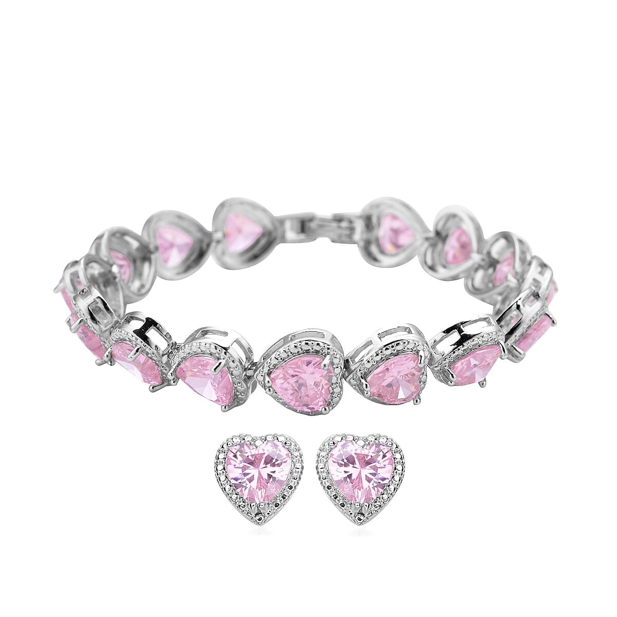 Simulated Pink Diamond Heart Shape Bracelet (6.50In) and Stud Earrings in Silvertone 45.00 ctw