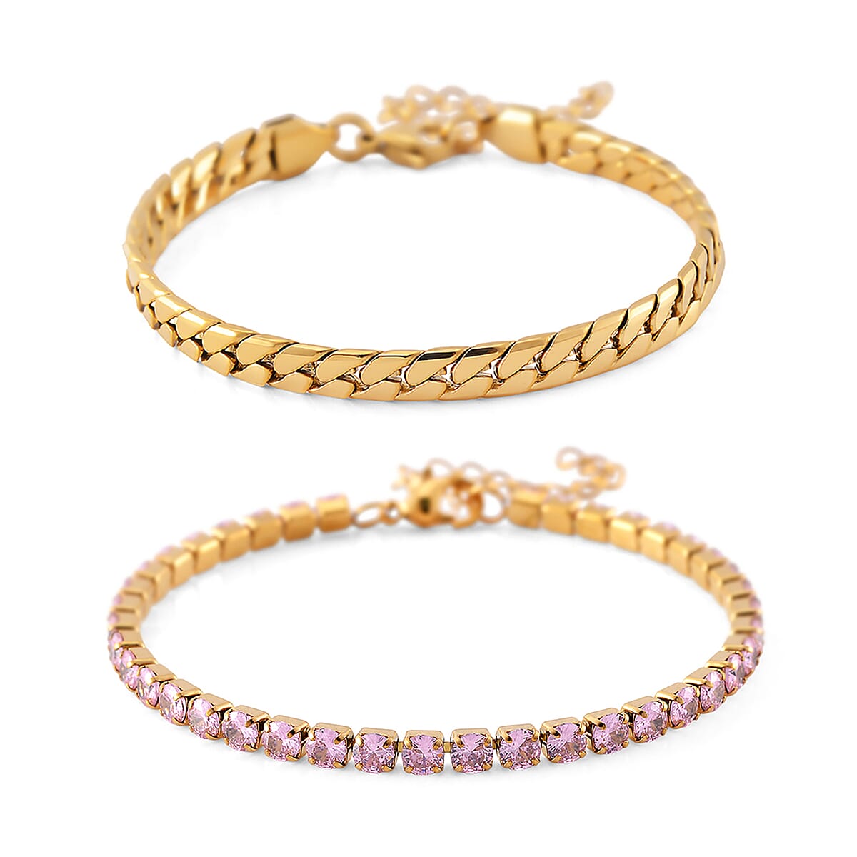 Simulated Pink Diamond Set of 2 Tennis and Curb Bracelet in ION Plated YG Stainless Steel (7.50-8.0In)