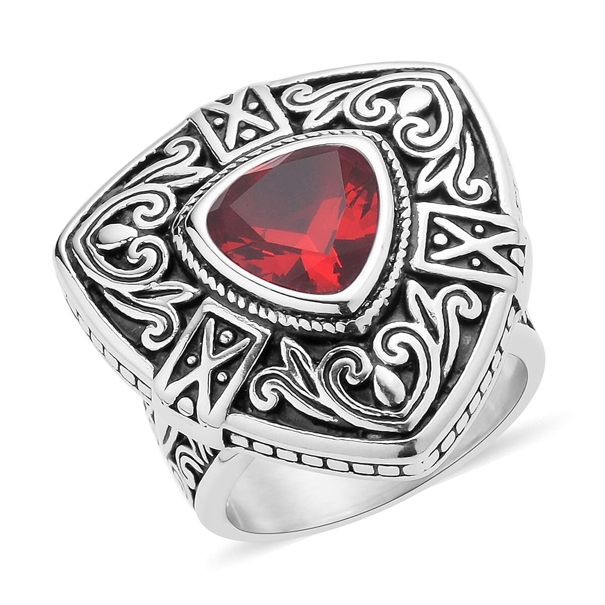 Simulated Ruby Color Diamond Filigree Ring in Black Oxidized Stainless Steel (Size 7.0) 15.00 ctw