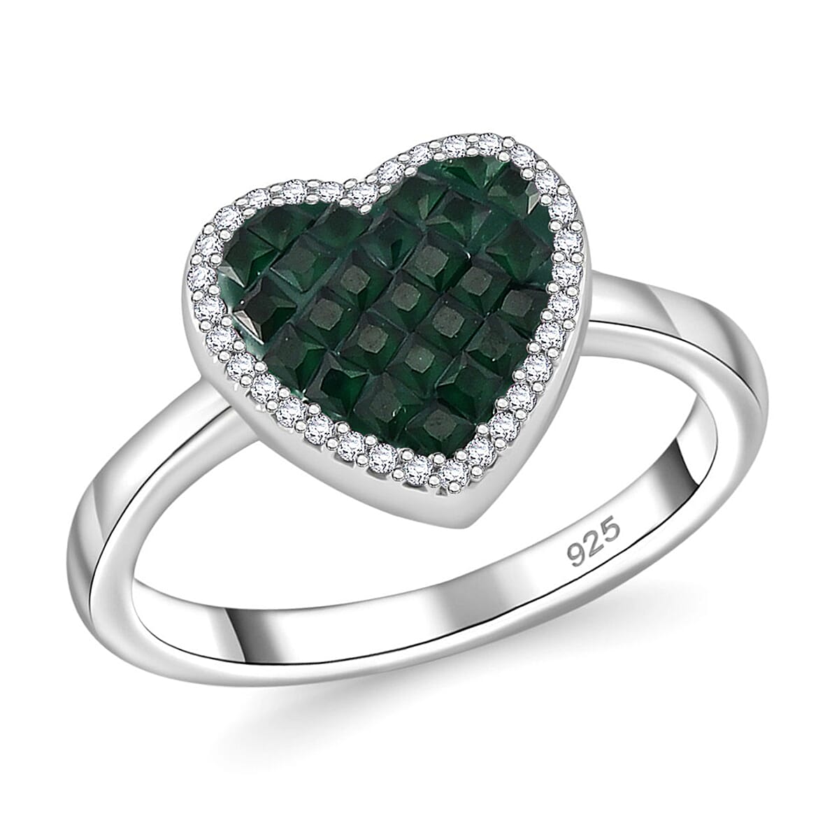 Simulated White and Green Diamond Heart Ring in Rhodium Over Sterling Silver (Size 10.0)