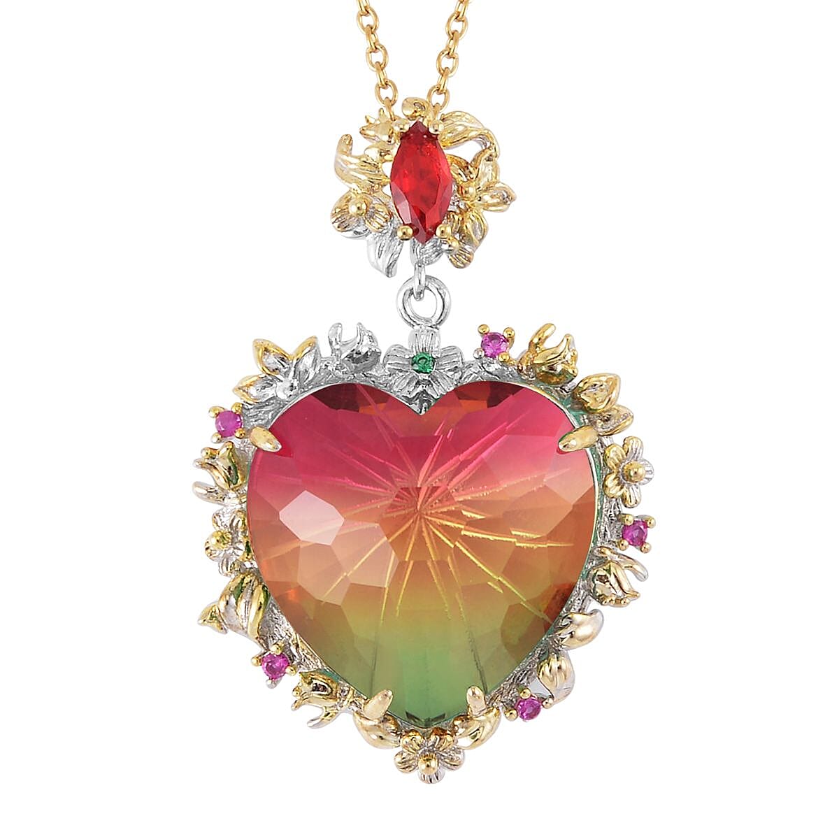 Simulated White Mystic Color Quartz and Multi Gemstone Heart Pendant in Dualtone with Stainless Steel Necklace 20 Inches