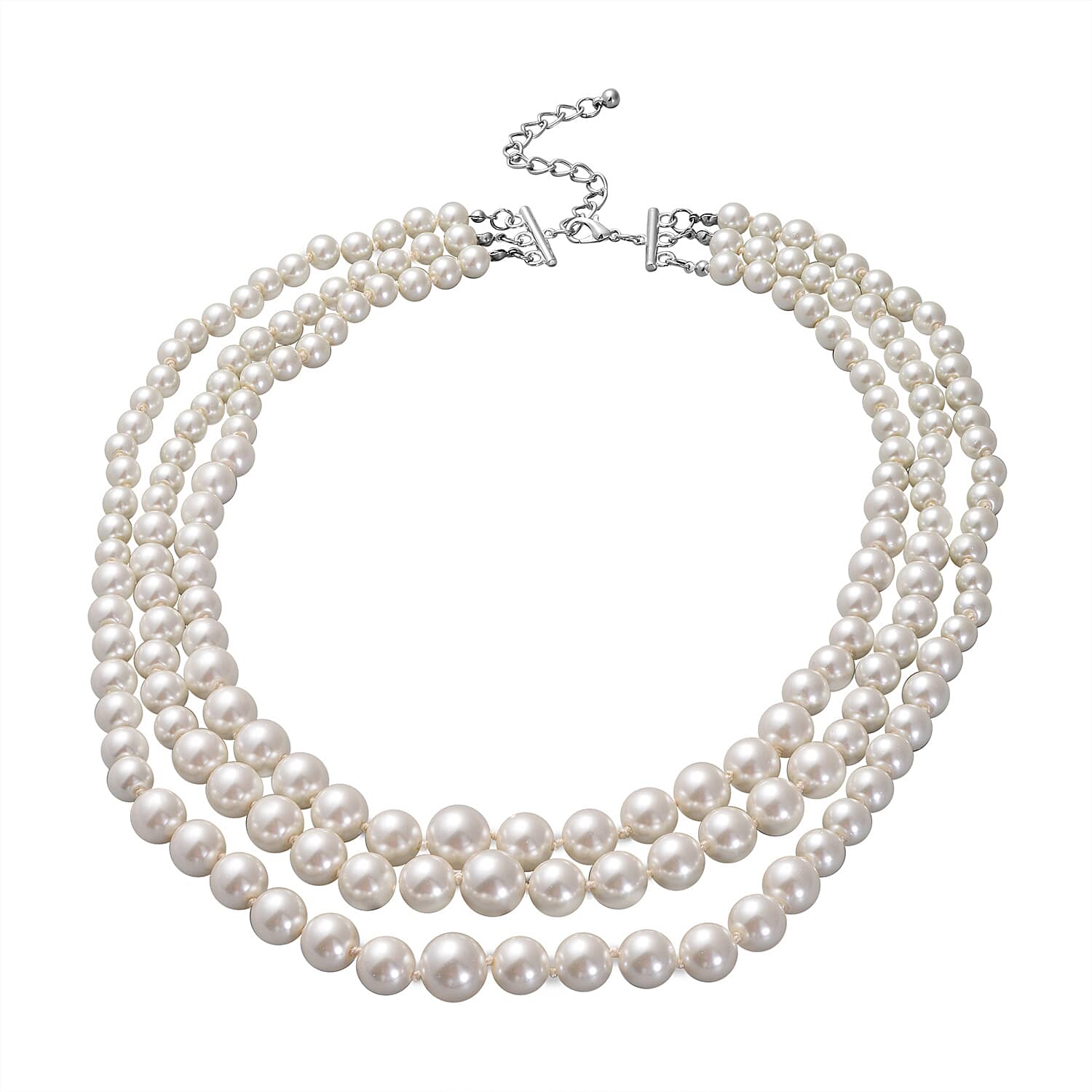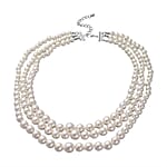 Simulated White Pearl Triple Row Necklace 23-27 Inches in Silvertone