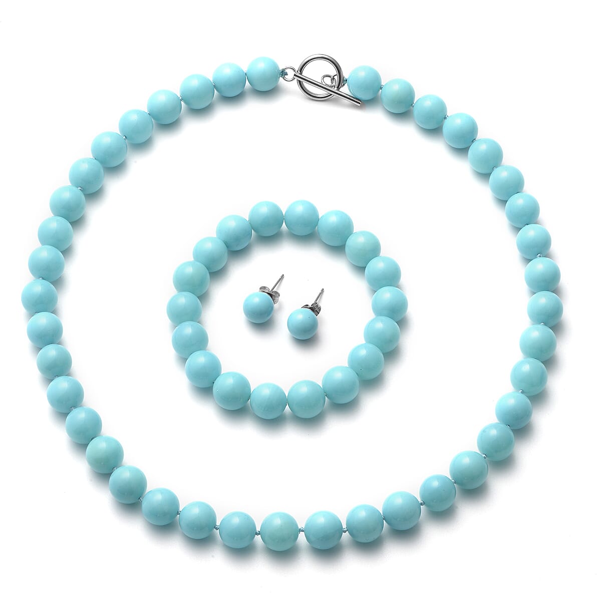 Sleeping Beauty Color Puka Shell Pearl Beaded Stretch Bracelet and Earrings and Necklace 20 Inches in Stainless Steel