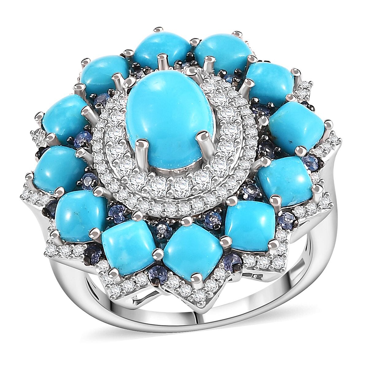 Sleeping Beauty Turquoise and Multi Gemstone 7.15 ctw Floral Ring in Rhodium Over Sterling Silver (Size 7.0)