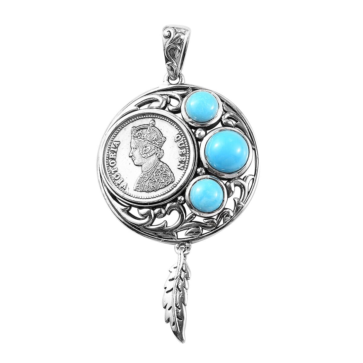 Sleeping Beauty Turquoise Queen Victoria Coin and Feather Pendant in Sterling Silver 2.80 ctw
