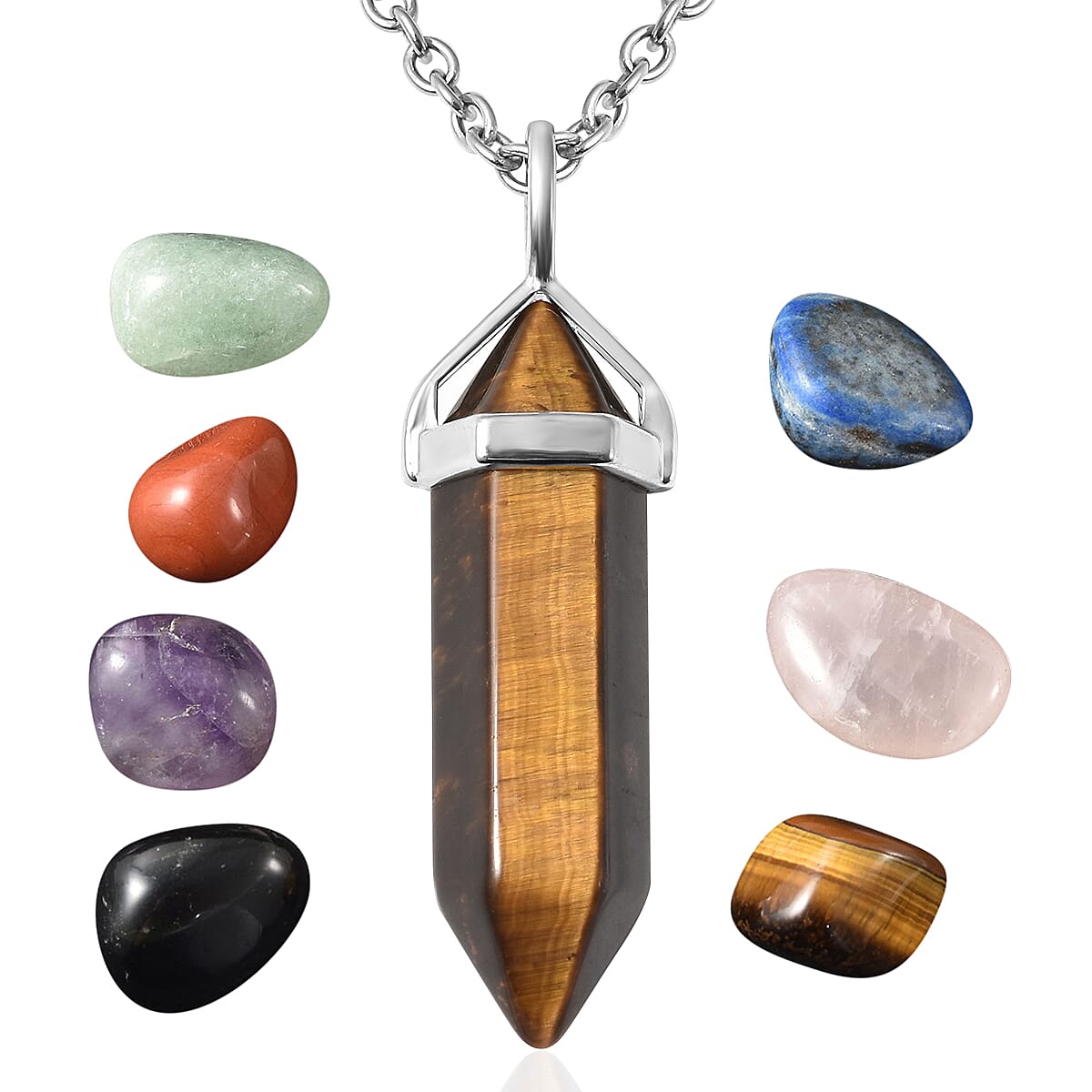 South African Tiger's Eye Pendant Necklace 20 Inches with 7 Chakra Tumbled Gemstones in Silvertone and Stainless Steel 307.50 ctw
