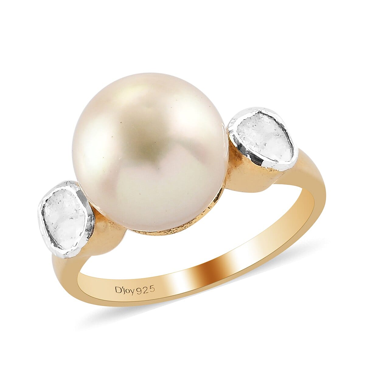 South Sea Pearl 9-10 mm and Polki Diamond Ring in 14K Yellow Gold Over Sterling Silver (Size 10.0) 0.20 ctw