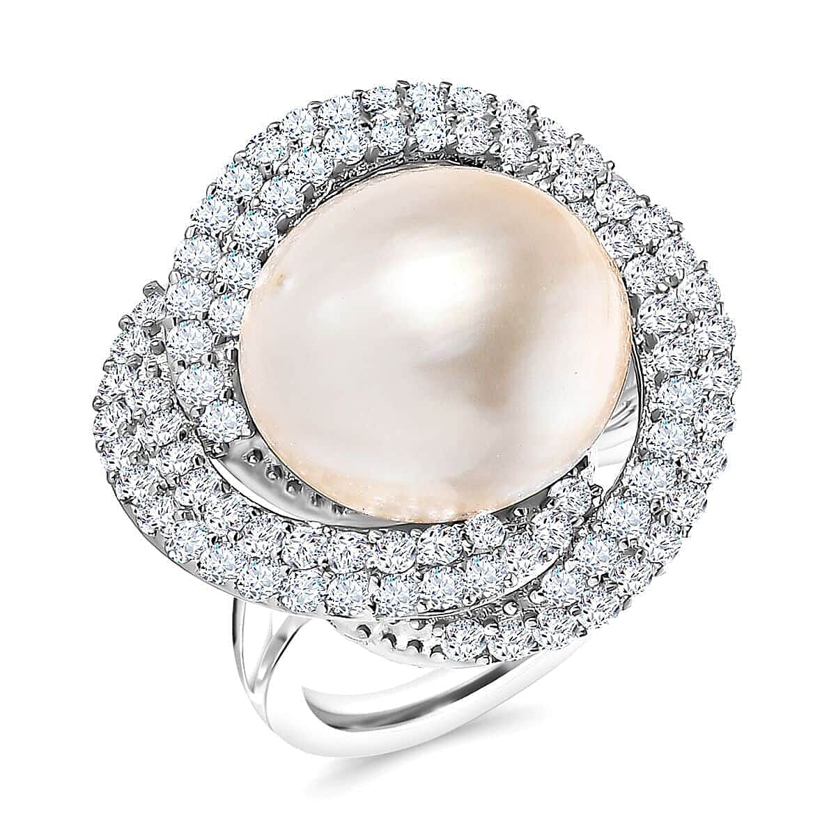South Sea White Pearl and White Zircon Ring in Platinum Over Sterling Silver 2.60 ctw