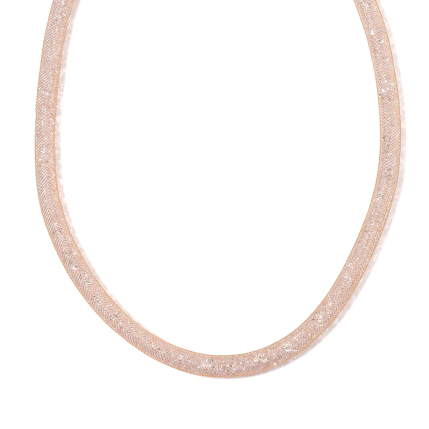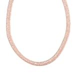 This Austrian crystal necklace features an intricate fishnet tube design filled with sparkling crystals. This 20 inch necklace artfully combines rugged texture with the delicate brilliance of the crystals, creating a striking visual contrast.